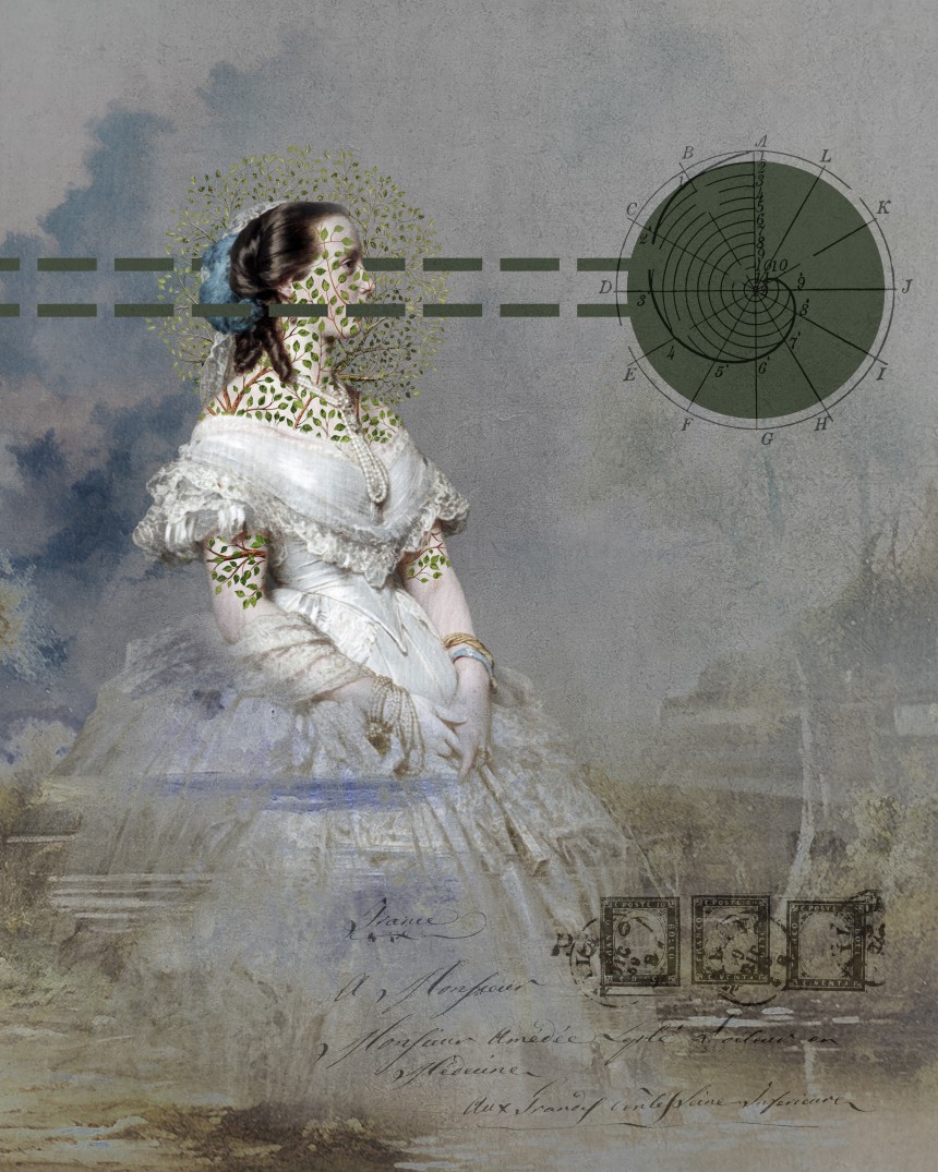 No.502 is a digital collage where a historical portrait meets nature, cartography, and abstract markings. Organic leaf patterns grow across...
